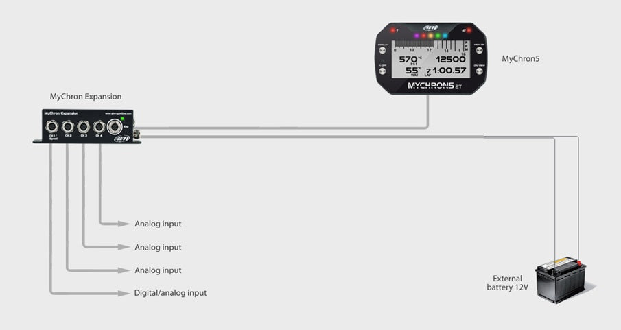 The AiM MyChron Expansion is a channel multiplier for improving MyChron6 (and previous generation MyChron5 and MyChron4 performances, thanks to four additional analogue channels and a further connection for the CAN bus. Through this last CAN connector, the dash can be connected to other AIM Motorsport products such as a LCU Lambda controller, SmartyCam HD (on-board camera) or a Data Key for data download. Thanks to its specific wirings, MyChron Expansion powers the MyChron dash and its peripherals with an external battery, avoiding internal battery consumption.
